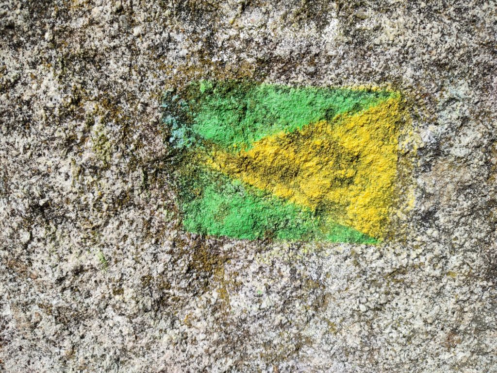 Señalización: flechas indicadoras y marcas en las piedras (amarillo/verde).